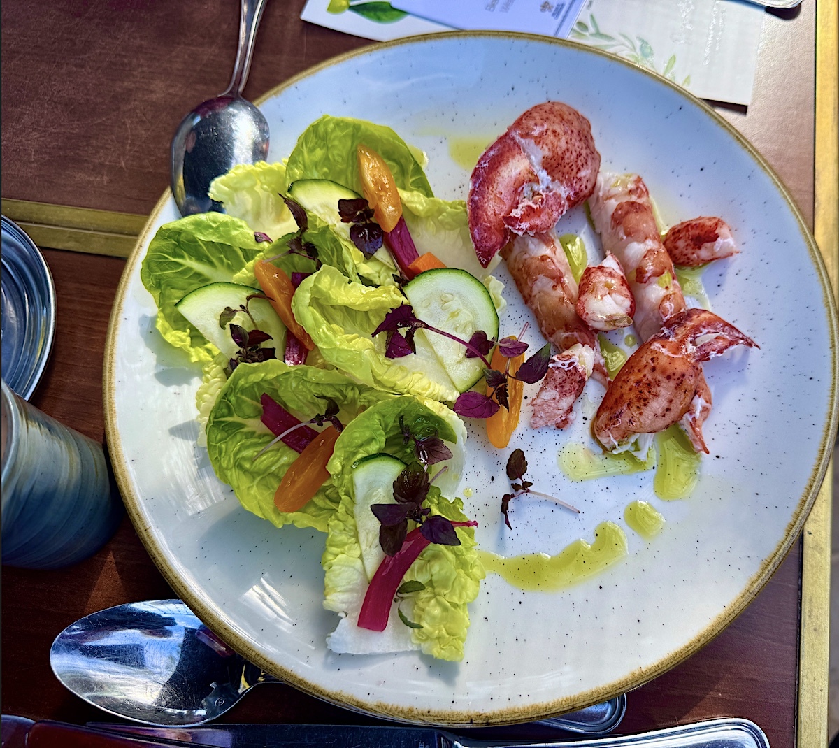 Le Homard de nos côtes rafraîchi, légumes croquants et sauce cocktail.