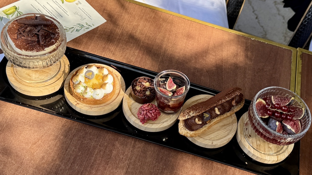La cheffe pâtissière Manon Isnard garde le même esprit bistrot pour son plateau des desserts du jour qui présente un Tiramisù, une Tarte au citron meringuée, un Café gourmand, un Éclair au chocolat ou une Coupe de fruits frais à base de figue et de fruits rouges de saison.