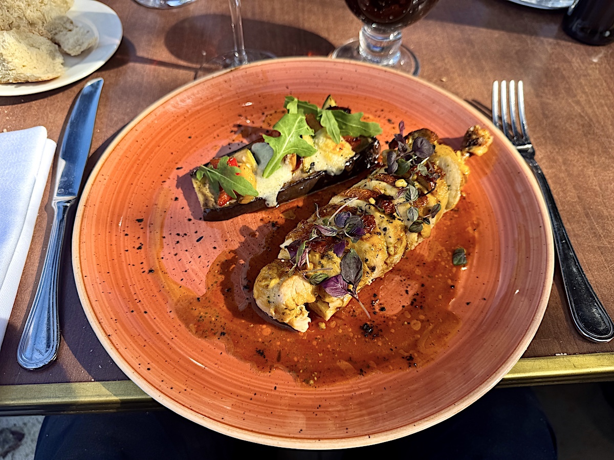 La volaille fermière contisée au beurre de thym du domaine et son aubergine façon Parmigiana.