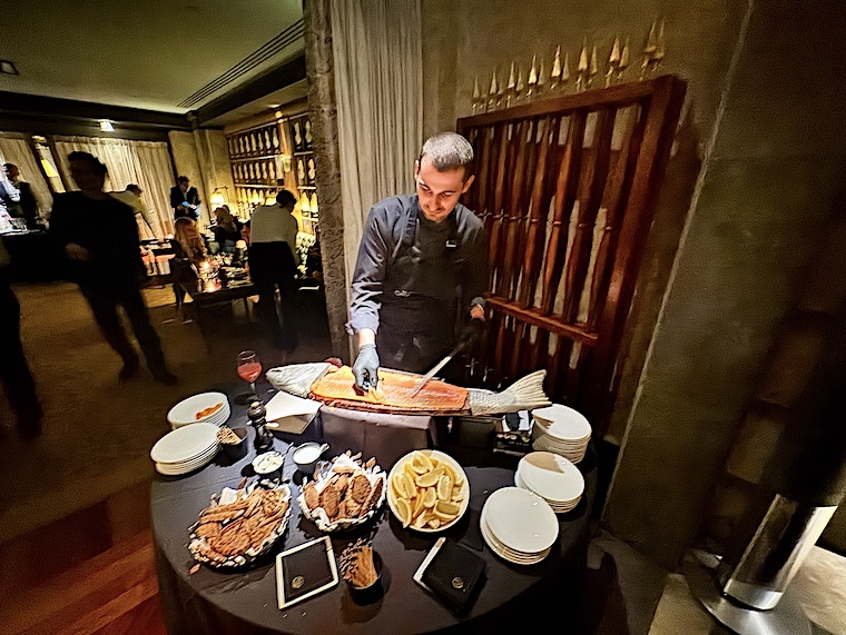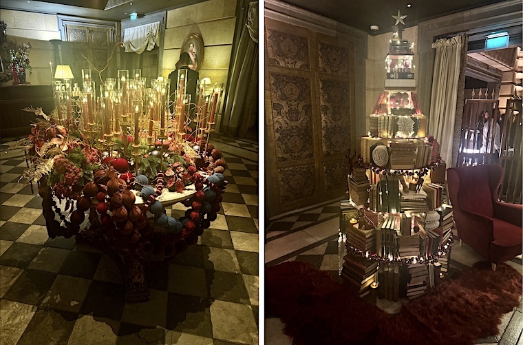 MÉTROPOLE MONTE-CARLO - L’esprit de Noël et des contes de fée imprégnait dès le lobby, les salons de l’hôtel avec ses bougies joyeuses, ses guirlandes lumineuses, ses sapins décorés, nous replongeant dans les émerveillements de notre enfance. La décoratrice Perrine Guyonnet (MissRose) avait imaginé une bibliothèque vagabonde dont les livres d’enfants s’étaient échappés des étagères pour folâtrer dans les sapins. Dans cet univers de fête, les buffets avaient été dressés pour offrir aux invités un avant-goût d’un Noël gourmand. Chacun allait d’une table à l’autre pour savourer une soupe à la châtaigne, de magnifiques huitres, un saumon à la chair moelleuse, délicatement fumé, du jambon ibérique pata negra, des crêpes Suzette ou quelques churros. Des plateaux circulaient proposant toasts au foie gras, au fromage de chèvre, pissaladière, barbajuans, gnocchis...