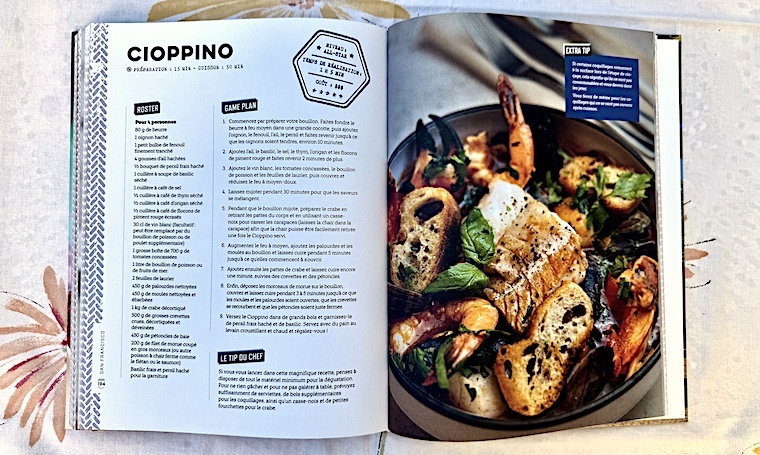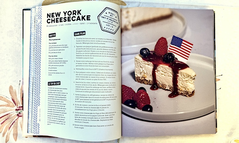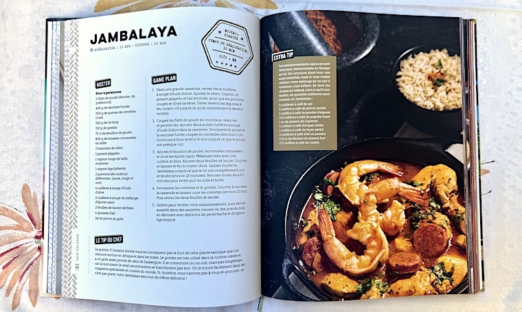 Attachez vos ceintures, décollage immédiat pour un survol de l’Atlantique nord et une première escale à Boston, la ville des Red Sox pour un Clam Chowder, sa grande spécialité de soupe aux palourdes, accompagnée pour la bande-son ’I'm shipping up to Boston de Dropkick Murphys (et oui, la tracklist est fournie pour chaque ville !). On longe la côte est vers la Floride, les villes s’égrènent offrant chacune ses recettes-phares : Hot-dog à New-York, Philly Cheesesteak à Philadelphie, Sweet potato pie à Charlotte, Jambalaya à la Nouvelle-Orléans. Dallas Style Ribs, Boudro’s guacamole à San Antonio... Au total 70 recettes made in USA avec une incursion à Toronto (Canada) pour y savourer une Poutine (très, très loin de la poutine qui se pêche au Cros-de-Cagnes !).