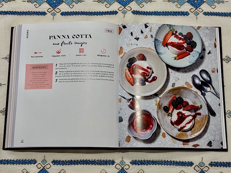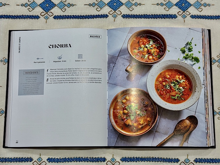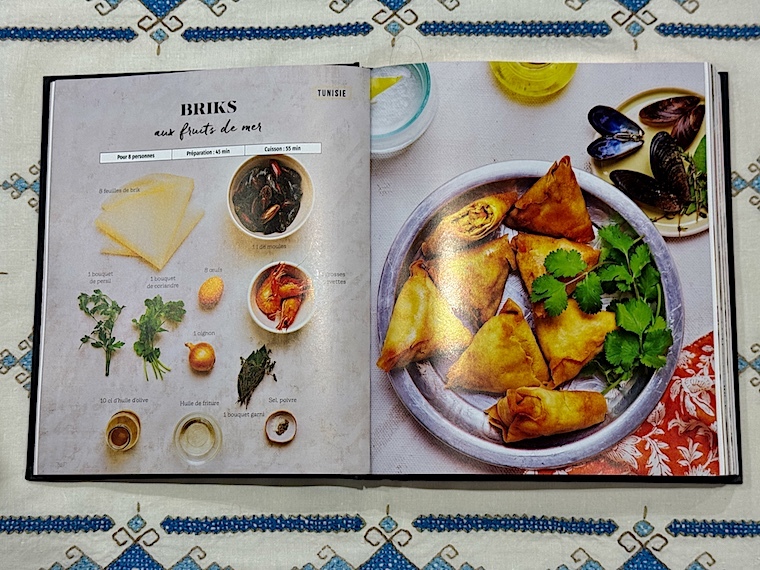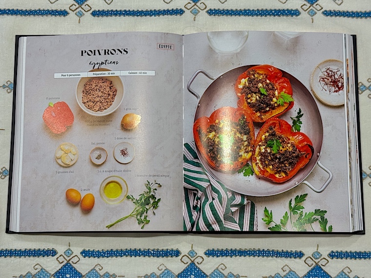 Le livre s’ouvre sur un chapitre consacré aux entrées et apéritifs, puis viennent les salades et les soupes, les viandes et volailles, les poissons et fruits de mer, les plats végétariens, les pains et, enfin, les desserts. Certaines recettes sont détaillées par un pas à pas en images, en outre , des pages thématiques, des suggestions de boissons, des informations sur certains produits emblématiques ou des trucs parsèment le livre. Trois index permettent de trouver les recettes par origine géographique, par ordre alphabétique et par ingrédient. Imaginez que vous souhaitiez réaliser un repas grec, libanais ou marocain pour épater vos amis, direction la page 340. À vous les Feuilles de vigne farcies au bœuf et au riz, la salade fattouche ou les Briouates au poulet...