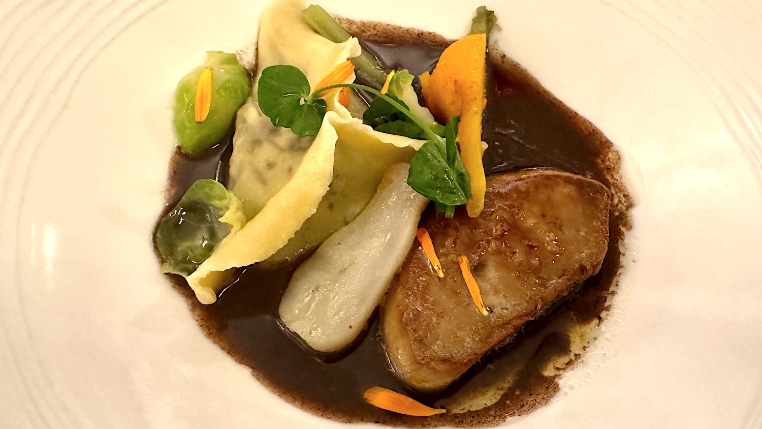 Foie gras des Landes poêlé, raviole de lièvre à la Royale, légumes racines et sauce au vin rouge.
