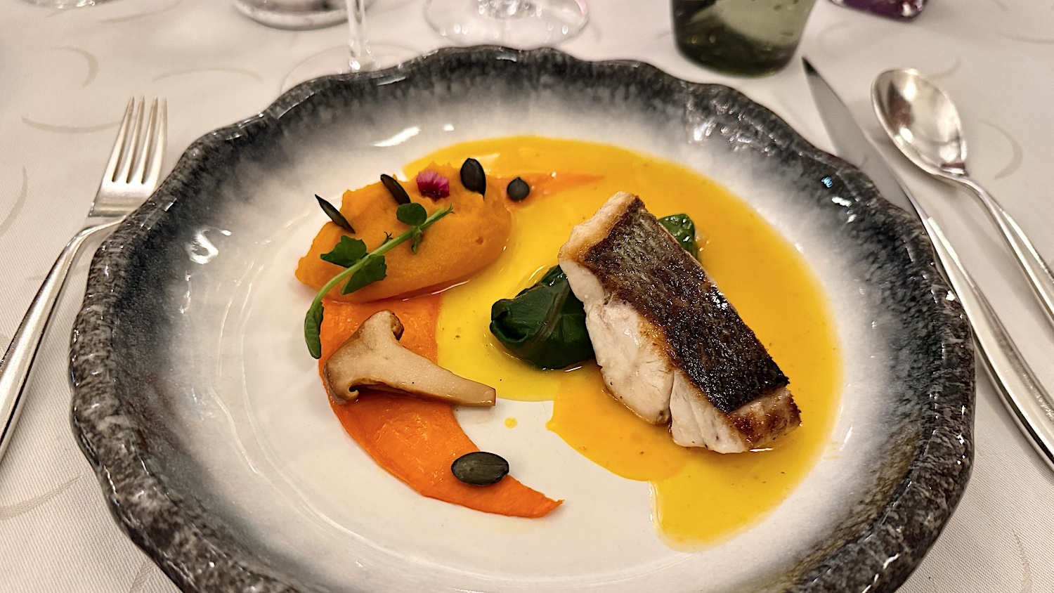 Loup de la pêche du jour cuit au « Teppan-Yaki » avec sa Raviole de légumes automnaux aux épices orientales, un éclipse de potiron et une mousseline de potimarron, jus de cucurbitacée à la cardamome