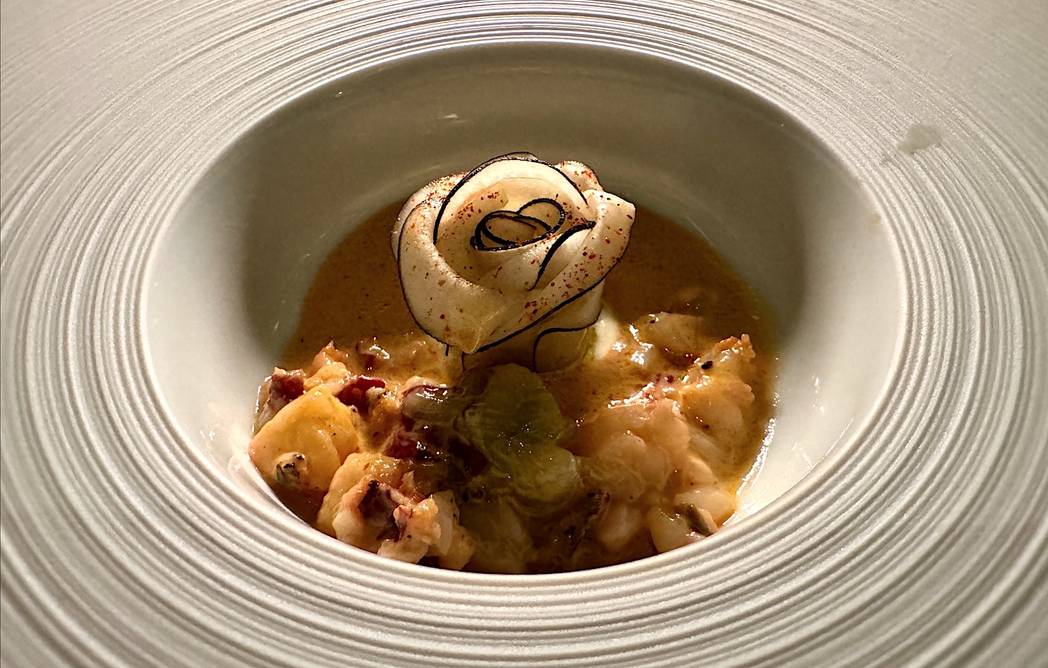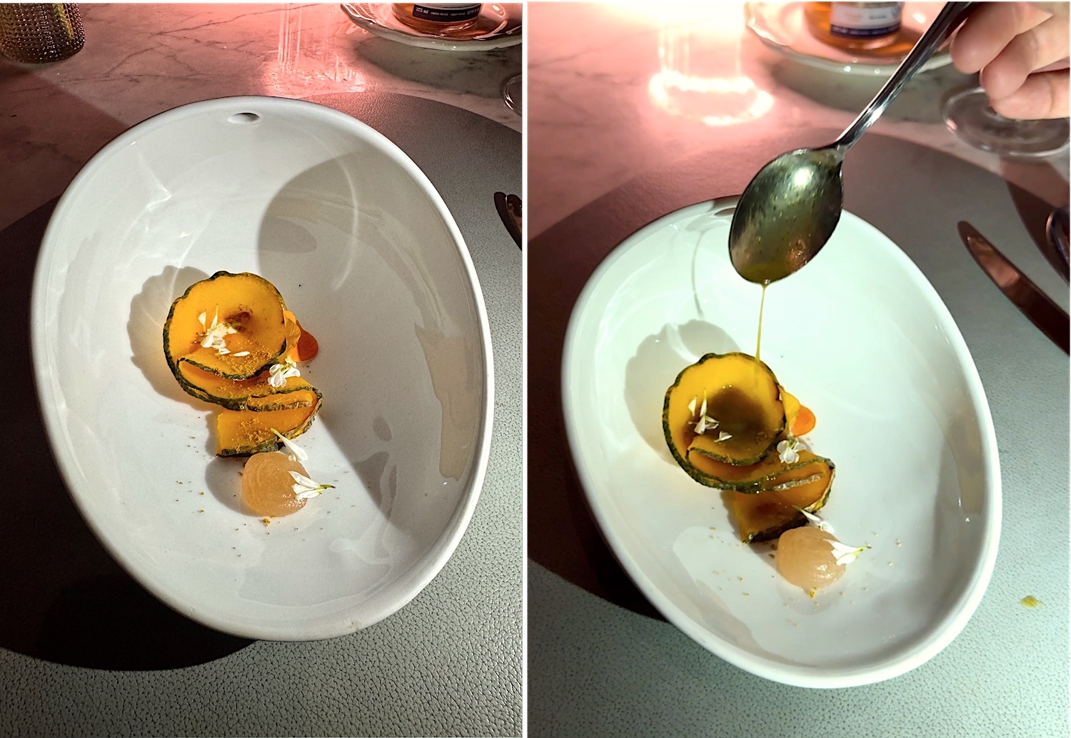 CARLTON FEST 2026 - S’installer à la table du chef en face de la cuisine ouverte et suivre la méticuleuse création des plats stimule la curiosité autant que l’appétitit jusqu’au moment où le chef sort de son antre pour présenter et commenter son plat aux convives. Cette première soirée festivalière s’ouvre avec un trio de mises en bouche composé d’une tartelette truite lavande, d’un tube tartare de bœuf et d’une tartelette mimolette. En entrée, un ruban de courge posé sur un lit de fromage de chèvre est enveloppé d’un bouillon d’algues. Le plat joue avec les matières - le moelleux du chèvre, le craquant de la courge - et le goût fumé-iodé du bouillon d’algues. Le festival de l’audace ne fait que commencer, Mallory Gabsi se révèle crescendo plat par plat.