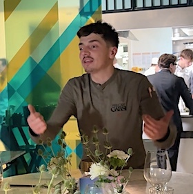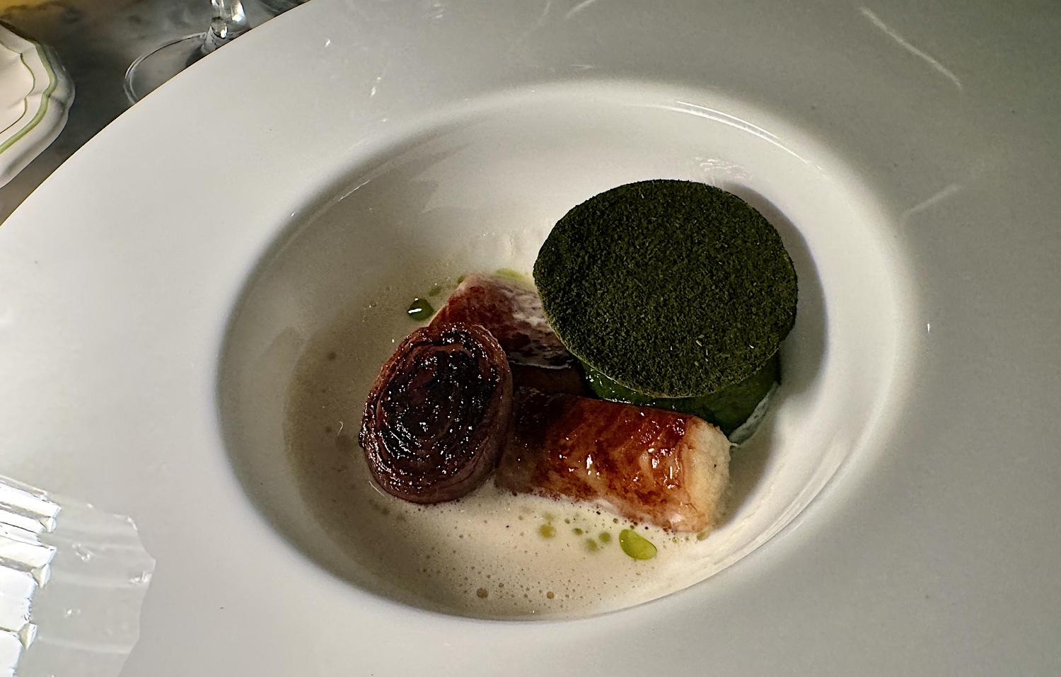 Au creux de l’assiette une rose de radis saupoudrée de piment d’Espelette est bientôt rejointe par un homard rôti au beurre noisette dans sa bisque. L’exploration des saveurs marines se poursuit avec délectation. C’est rond en bouche, moelleux et corsé à la fois. La sommelière propose un Chablis Domaine Jean Dauvissat Père et Fils. Puis le chef Mallory Gabsi vient présenter son plat signature - une version 7 - en lien avec ses origines belges, en hommage à une recette des Flandres orientales, l’Anguille au vert, un plat de pauvres qui réunissait les familles; les anguilles étaient cuites avec des herbes sauvages et des échalotes. Ici, le chef joue sur les amers : l’anguille est fumée et laquée à la bière Chimay bleue, posée sur un voile de champignons qui apporte un peps végétal et du citron caviar pour le notes acides. L’échalote est elle-même confite au bouillon d’anguille fumée à la bière, et la fameuse purée d’herbes se compose d’ortie, d’oseille, d’épinard, de cerfeuil et d’autres herbes dont il ne dévoilera pas le nom. Au moment du service, une crème d’échalote vient porter la touche finale. Les convives sont éblouis par l’assiette, la plupart découvrent l’anguille, un plat peu répandu sur les cartes azuréennes. Le plat soulève un engouement général autour de la table tant les alliances de goûts sont subtiles, même les notes amères ne sont pas provocantes. Le temps fait une pause pour laisser chacun profiter pleinement de l’expérience gustative. Un Condrieu Les Grandes Chaillées du Domaine Monteillet de Stéphane Montez joue l’accord.
