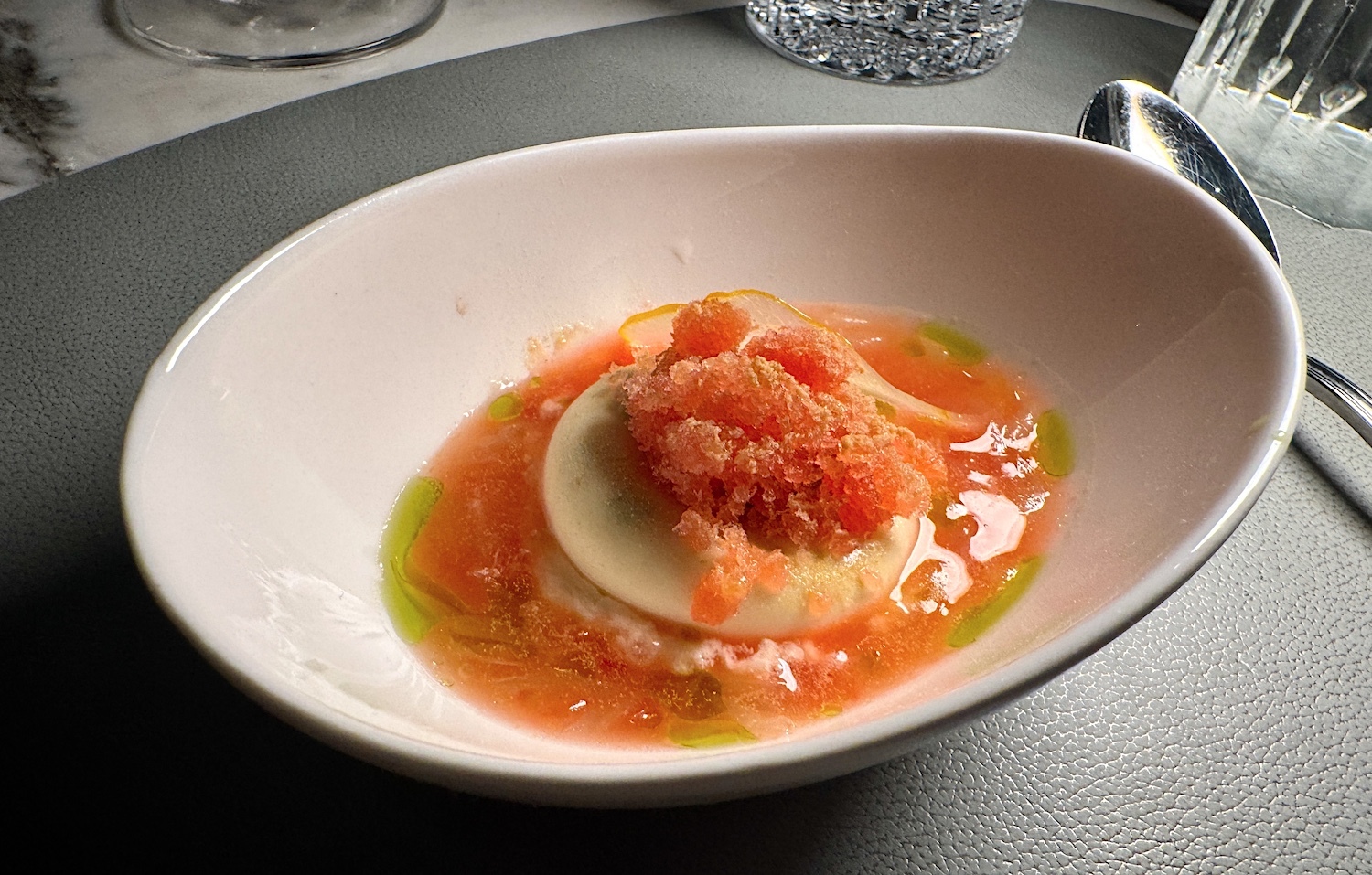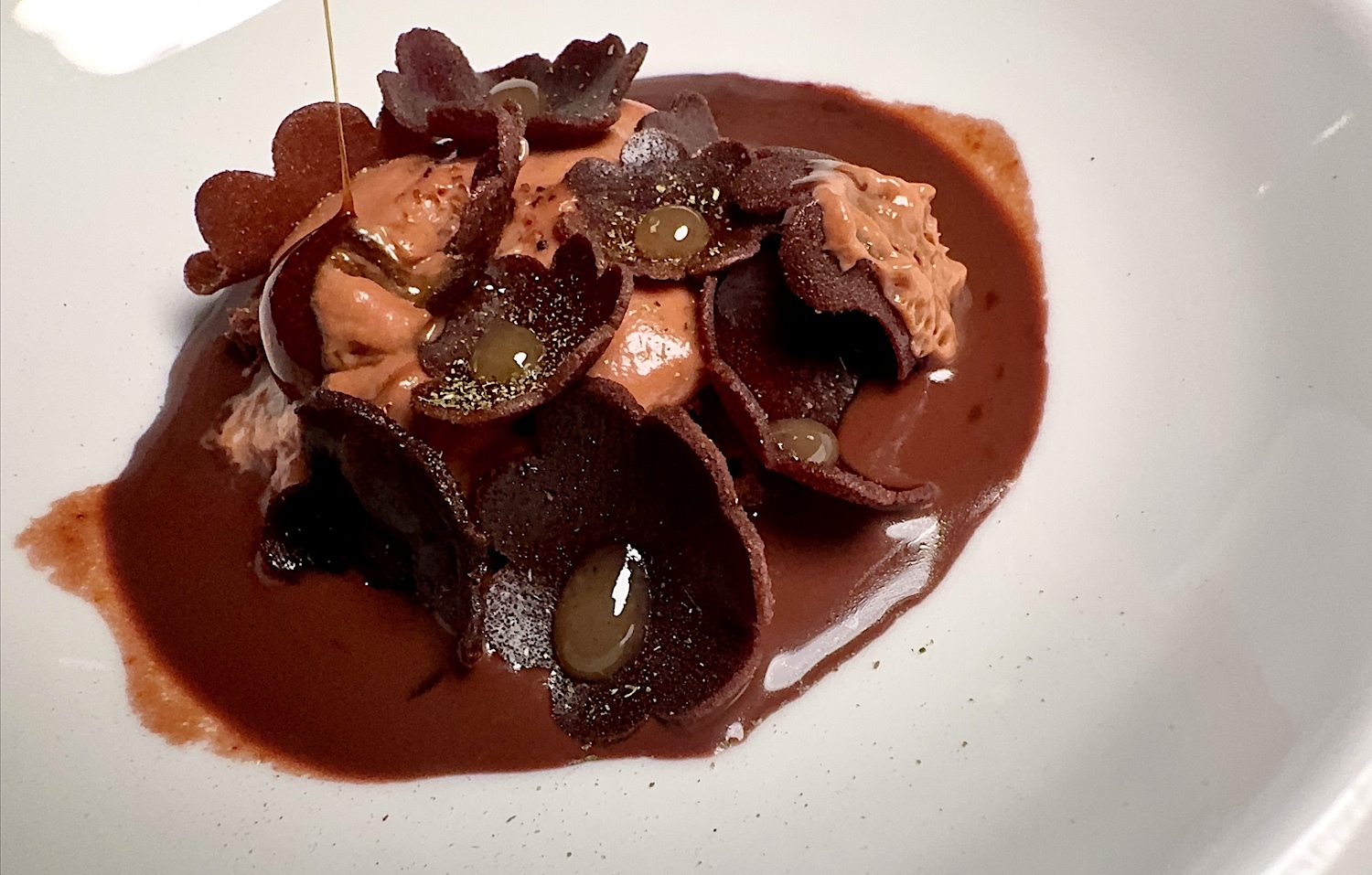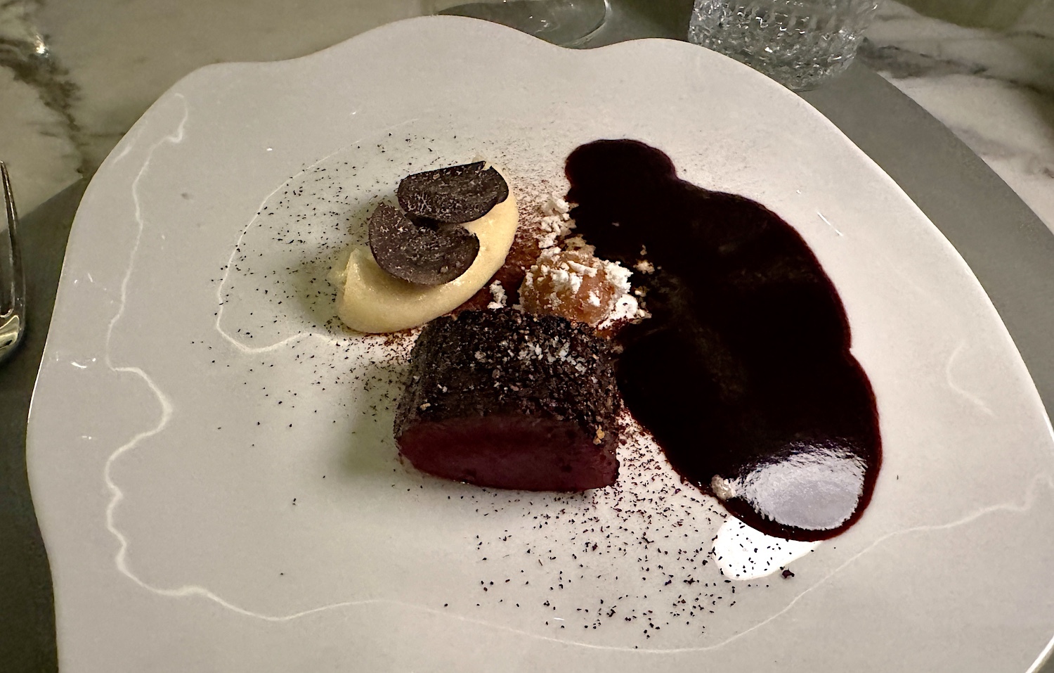 L’aventure se poursuit avec un Chevreuil, Oursin, Truffe que le chef présente comme une co-création avec son second Paul Boudy, déclarant même « Je suis le chevreuil, Paul l’oursin. » Le plat terre-mer explore les sous-bois et les fonds marins; notes d’herbes et de terre rivalisent, sans se heurter, avec les tonalités salines et iodées de l’oursin. Les goûts sont puissants mais non arrogants. La sommelière a pensé à un Barbera d'Alba Vietti Trevìe 2023, un vin structuré et puissant qui peut s’harmoniser avec le plat. Le chef a proposé un menu d’une grande originalité mais sans forfanterie, ni esbrouffe, son maître-mot est l’Équilibre, c’est exactement ce que l’on ressent en dégustant chaque plat. On pense aux vers de Rodrigue dans Le Cid : « Je suis jeune, il est vrai mais, aux âmes bien nées, la valeur n’attend point le nombre des années. » Le repas se vit comme une expérience sensorielle; Mallory Gabsi nous conduit dans son monde mystérieux où se rencontrent des goûts qui peuvent surprendre sur le papier mais se révèlent des alliances riches d’audace et de maîtrise.