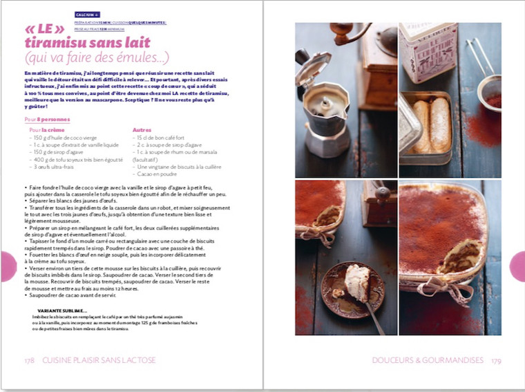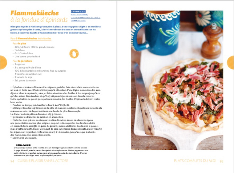 Marie Chioca imagine des recettes sans lactose pour tous les moments de la journée du petit-déjeuner au dîner en passant par le déjeuner avec des entrées et des plats complets et le goûter. Des pictogrammes signalent les recettes sans gluten, sans œufs ou végétaliennes ainsi que les apports en calcium.