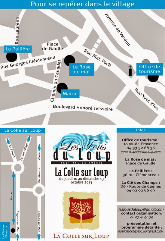 FESTIVAL POÉSIE LA COLLE - La 2e Édition du Festival "Les Fous du Loup" se saisira de la clé des champs à La Colle sur Loup à partir de 20h30, le jeudi 10 octobre 2013, et se clôturera dans la nuit du dimanche 13 par un banquet dans la grande tradition médiévale avec ses fous du roi, ses mangeurs de feu, ses jongleurs inspirés et ses funambules sur le fil ténu de la vie.
