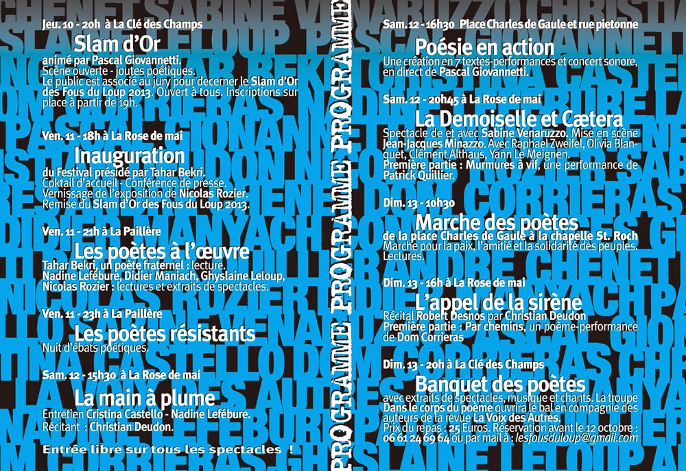 - à 20h00, "Le banquet des poètes", à La Clé des Champs (poésie, jeux de langues, extraits de spectacles, musique et chants, performances …). La troupe "Dans le corps du poème" ouvrira le bal. En compagnie de musiciens et des des auteurs de la revue "La Voix des Autres", les invités, des musiciens et maîtres chanteurs se réuniront en compagnie de leur public . Clôture du Festival …