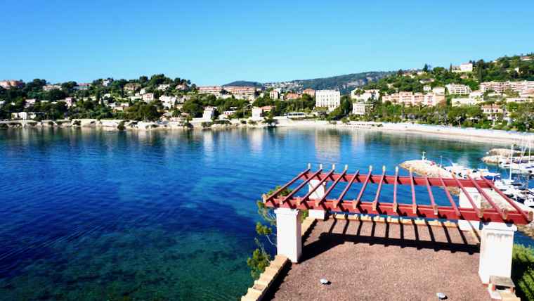 Légende de la photo du haut : la Méditerranée, la baie des fourmis et la presqu'île de Saint Jean Cap Ferrat vues depuis le toit-terrasse de la Villa Kerylos à Beaulieu-sur-mer.