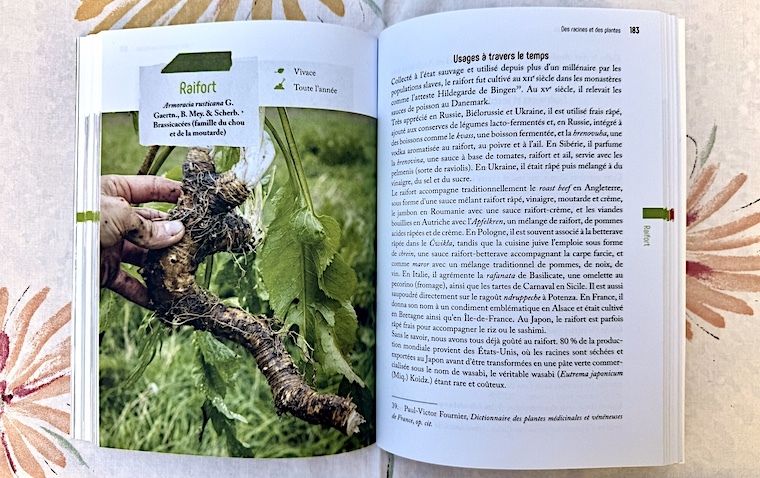 Le livre est à la fois un cours de botanique, d’histoire et de cuisine. Le lecteur est invité à plonger sous la terre à la découverte des racines qui, selon les plantes, peuvent être des rhizomes, des tubercules, des bulbes, des caïeux, des cormes. Quel monde fascinant de diversité !